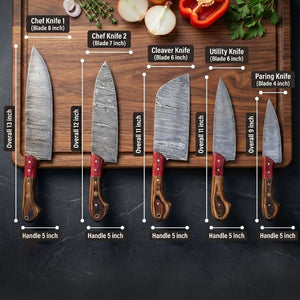 Discover Scorpion Kitchen Knife as epitome of culinary excellence with our Pro Chef Knife Set, a collection crafted for both seasoned chefs and cooking enthusiasts. Each knife is meticulously handmade with precision, featuring custom Damascus steel knives that not only showcase top-tier quality but also offer a unique aesthetic appeal. Crafted with the utmost care and passion, each knife in this set is a stroke of culinary genius. From the perfectly balanced blades to the custom Damascus steel, every detail exudes pride in craftsmanship. This Kitchen Set is a testament to the fusion of artistry and functionality, providing chefs with the tools they need to elevate their cooking to new heights.