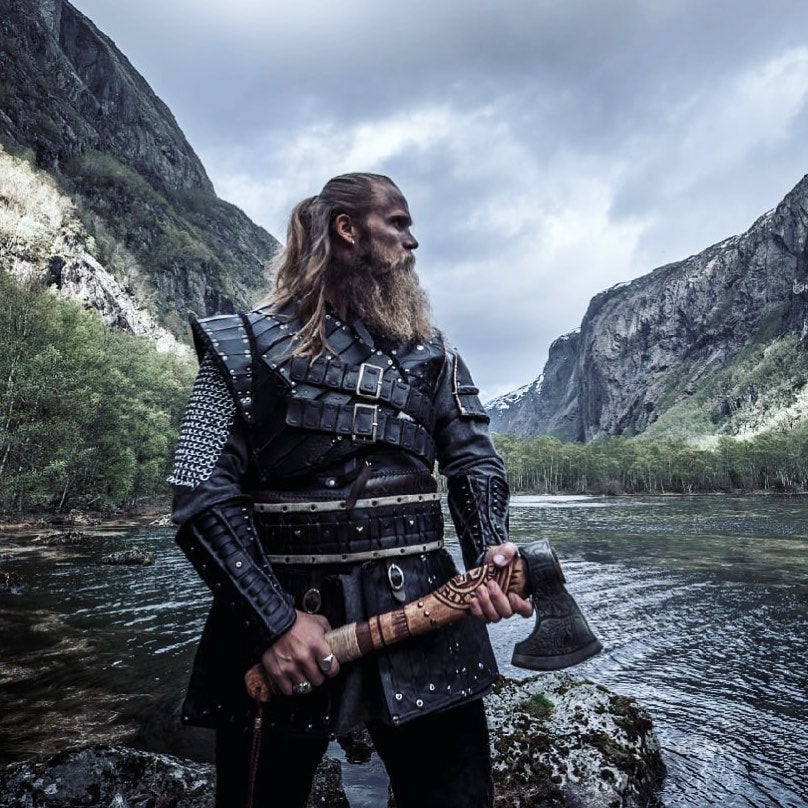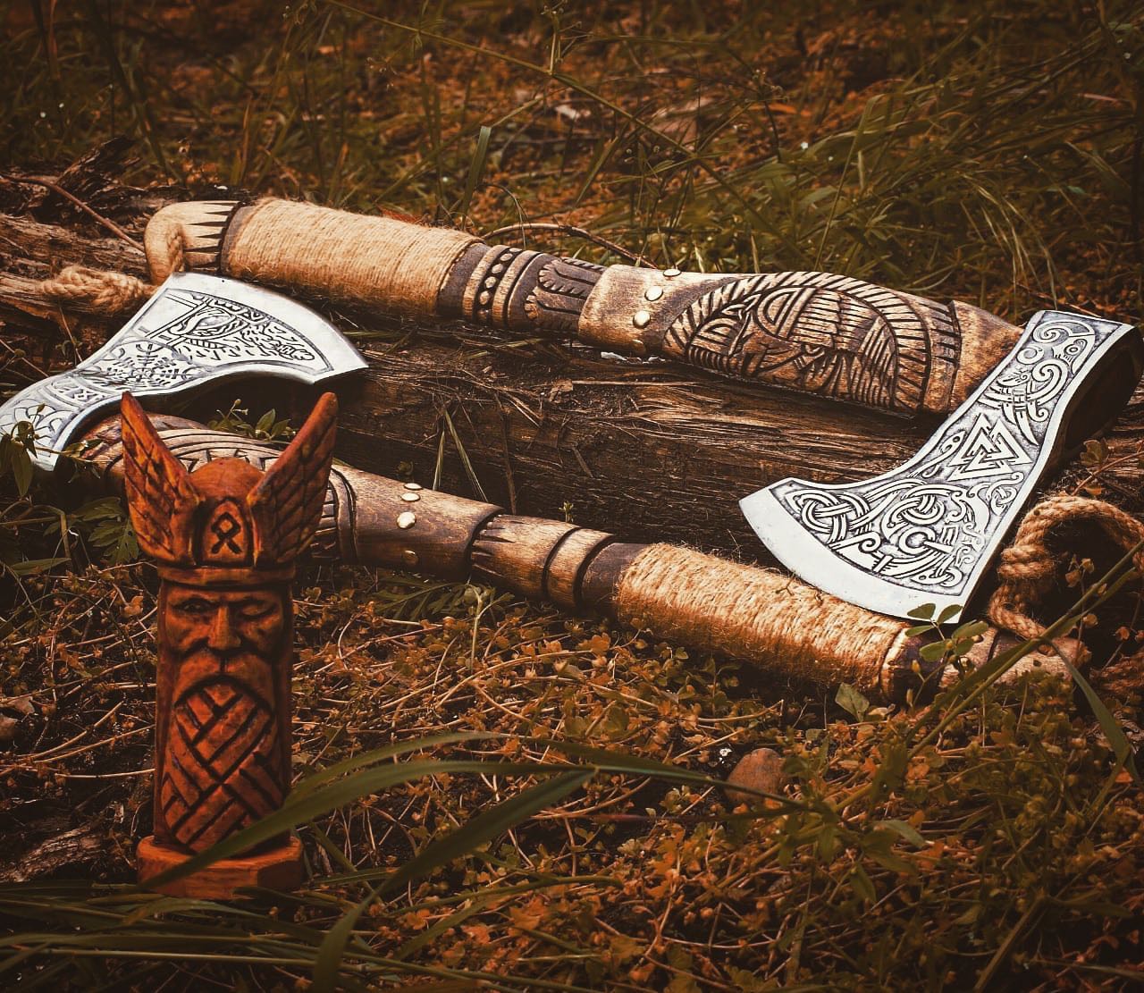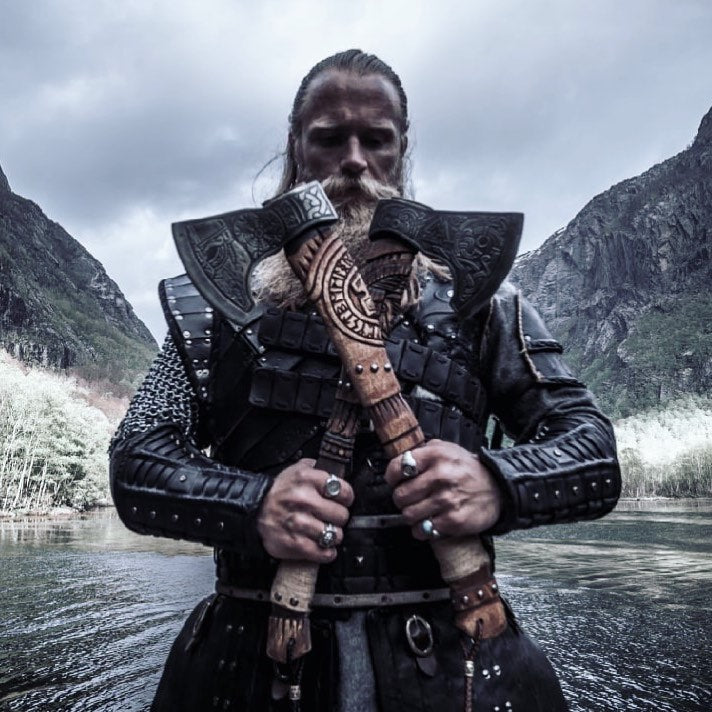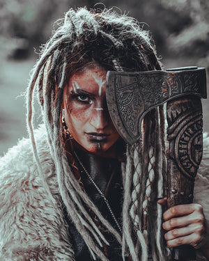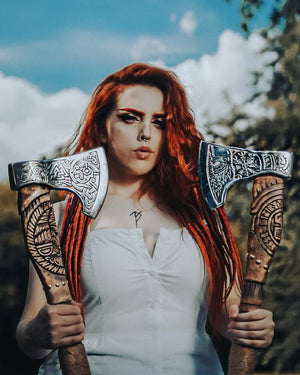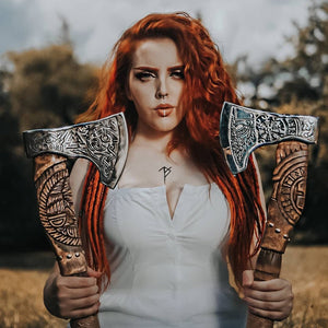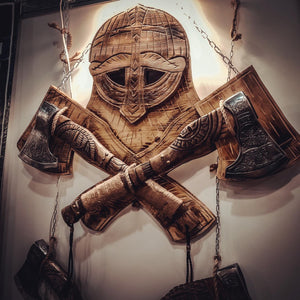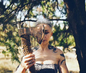 Helm of Awe Viking Axe, is a handmade axe with a very high-quality product, engraved with an image of Odin and the traditional Norse ‘helm of awe’ symbol. A powerful and protective symbol, the purpose of the Helm of Awe is primarily to protect against illness and disease It's more than just a tool for chopping wood. The Helm of Awe Viking Axe is imbued with the traditional Norse 'helm of awe' symbol, known for its powerful protection against illness and disease. Crafted by hand and engraved with an image of Odin, this axe represents both strength and defense.