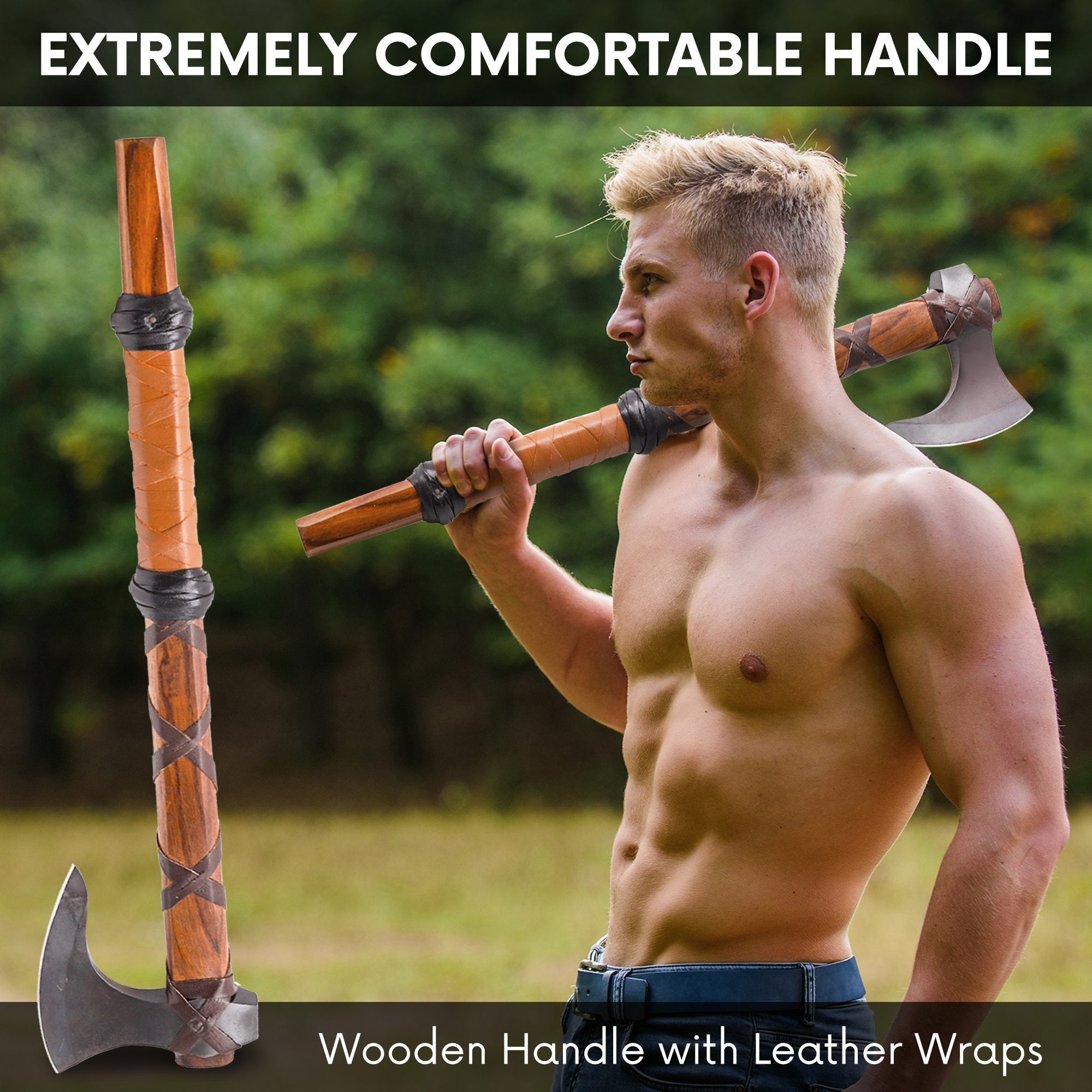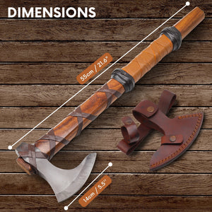Ragnar lothbrok Viking axe was inspired by the original axe used by Ragnar, The axe also called the bearded axe to the shape of the head. The material of the head is carbon steel, and the head of this axe is robust and sharp. The handle is made of hard rosewood which makes it durable, dense, and very tough. The leather straps make the strong grip of the handle which gives you a smooth grip and feel of nature. We are also providing a leather sheath for the head which is covered the axe head when you don’t use it or prevent injury. Dominate your next battle with the Ragnar Lothbrok Viking Axe. Made from strong carbon steel, the durable and sharp head is inspired by the original bearded axe used by Ragnar himself. The sturdy rosewood handle boasts a smooth and comfortable grip, thanks to the leather straps, giving you the feeling of nature in your hands. And for added safety and protection, we also provide a leather sheath to cover the head when not in use.
