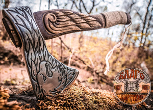 Norse Raven Symbol Etched on Viking axe was a very common tool or armour in Viking History. Everyone owned a Viking axe that could be used as a dangerous armour in Battle. All axes were designed specifically for war. This axe is handcrafted specifically for each order. This is a very high-quality product whose head is carbon steel and handles material is ash wood wrapped with rope. Experience the power and precision that comes with a handcrafted Viking axe. Made with a carbon steel head and a sturdy ash wood handle wrapped with rope, this axe is built to withstand the toughest of battles. Trust in its design, crafted specifically for war, and be prepared for whatever challenges you face.