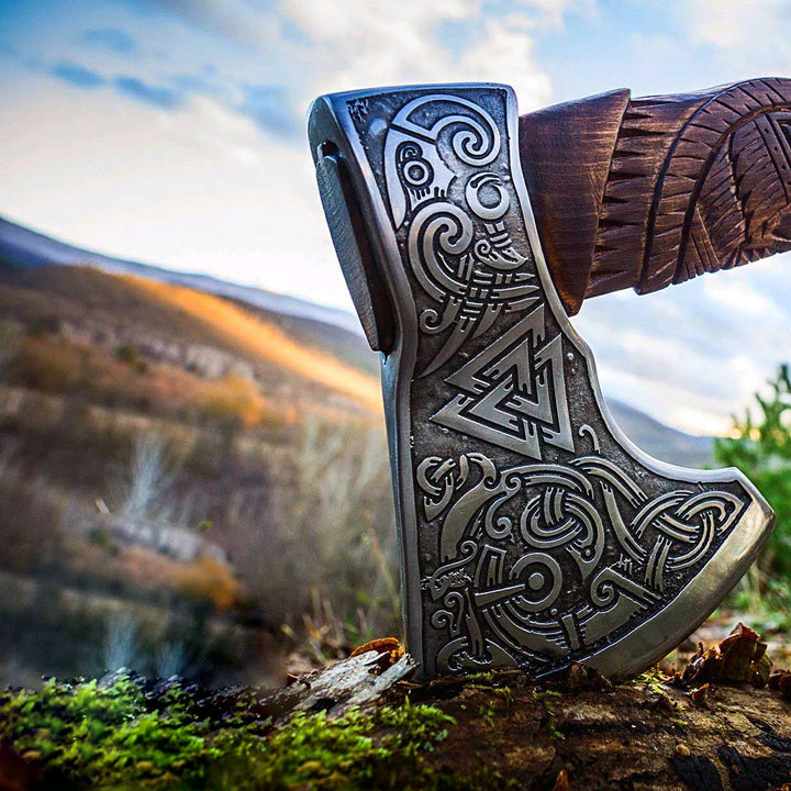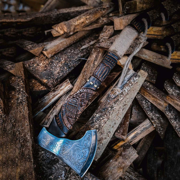 Celtic Valknut Viking Axe With Wood Carving Handle