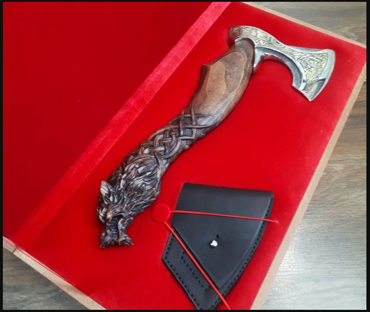 Custom Wood Wolf Handle Carbon Steel Viking Axe. The Viking Axe is an art piece in which Ram Head is Carved on the handle of the axe. It's a perfect gift for him/her. It will come with sheath and a beautiful wooden box which can be engraved with personalization.