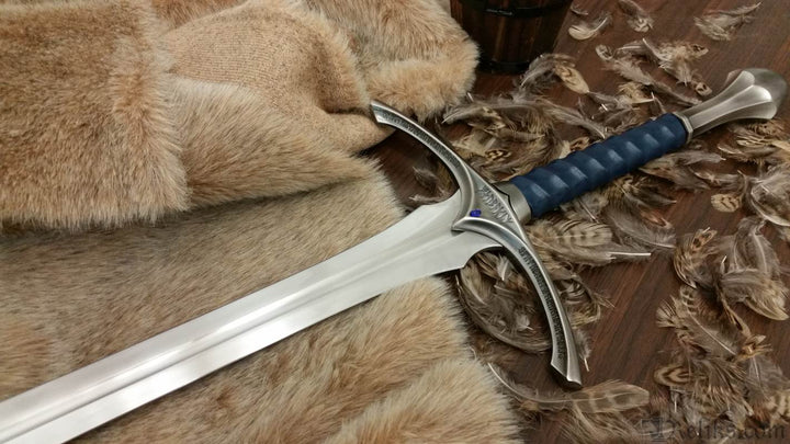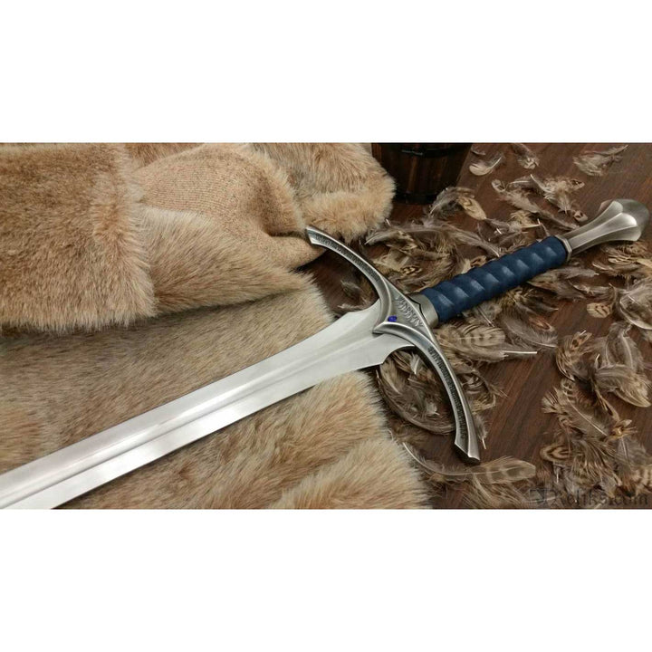 This hand-made Viking sword, inspired by Gandalf's sword from Lord of the Rings, is a truly unique and powerful gift for men. With its intricate design and monogram detail, this sword is sure to be cherished for years to come. Perfect for display or as a functional piece, this sword is a must-have for any LOTR fan.