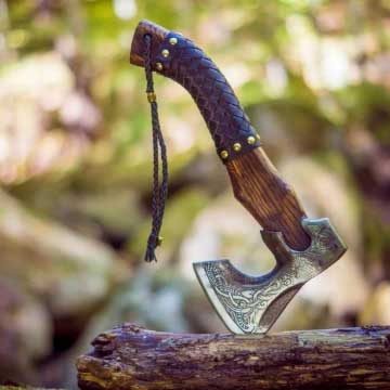 The Viking Axe is Vine Axe the tool most used by the Vikings. This one is suitable for Vikings who like to wield a Hand Ax with a fearsome edge and a leather handle to have Odin's worthy punching power.This axe is handcrafted specifically for each order. This is a very high-quality product whose head is carbon steel and handle material is ash wood wrapped with leather. Historically, the Vikings also used forged carbon steel. It is in particular thanks to the durability of this steel that we still have very well-preserved Viking armoury in museums today. One of the key benefits of the Fully Hand-Forged Vine Viking Axe Best Gift is its durability. Made from carbon steel, both the head and handle are designed to withstand heavy use. This means that this axe is not only a powerful tool for Vikings, but its strength also ensures that it will last for generations to come. In fact, many Viking artifacts that are made from forged carbon steel are still preserved in museums today, a testament to the quality and longevity of this material. Invest in the best with the Fully Hand-Forged Vine Viking Axe Best Gift.